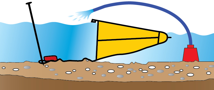 - Alussa vedettömän alueen tason asteittainen lasku. Kofferdam-kangas painetaan vain osittain maahan, vedeneristys on osittainen, joten hyvän painolastin merkitys etureunassa.